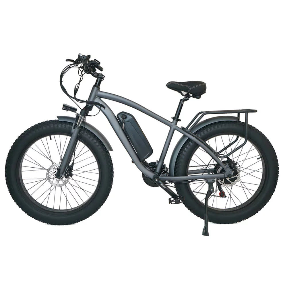 In a word, 750 watt electric mountain bike 26-inch aluminum alloy frame body, features 4inch fat tire wheel with 15Ah removable battery. Easily ride on beach, snow, hill, mud.