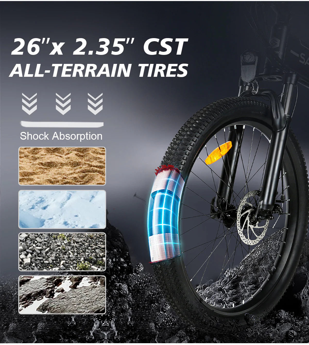 The fork and rear suspension with 2.35" fat tires minimize roadside bumps and greatly improve riding comfort.