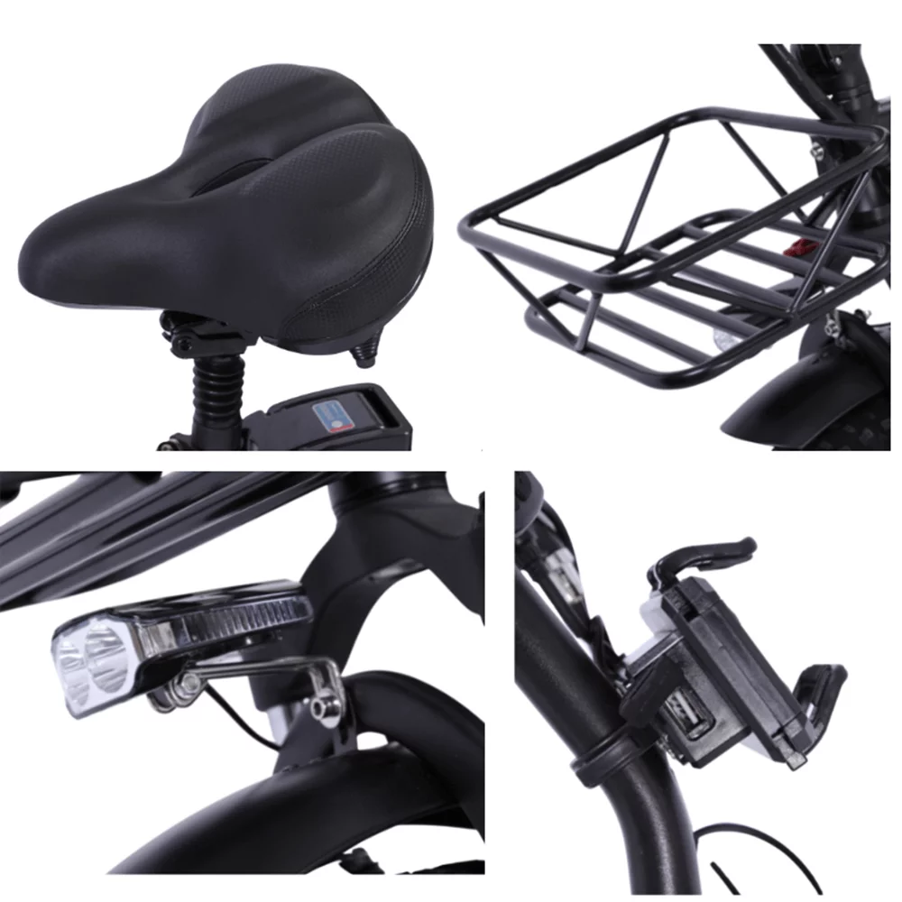 Our Gw20 fat tire electric bike has a oversized Comfort seat with a shock-absorbing elastomer. This is a lightweight foam seat made of high-quality waterproof artificial leather and filled with decompression function, bringing you a very comfortable experience.