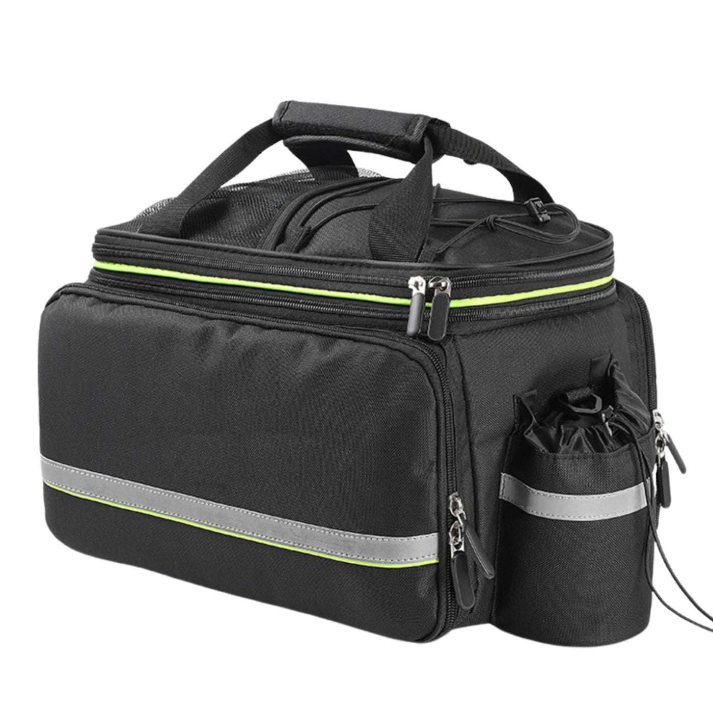 Made of high-density nylon fabric with excellent abrasion resistance, scratch resistance and water resistance. The inner bottom of the bicycle luggage bag is filled with thick foam pads, which has a stable structure and is not easily deformed. Even if there is nothing inside, it will not collapse to maintain its shape and protect your belongings. The side pockets and water bottle pocket are designed with reflective strips to increase visibility and safety at night.